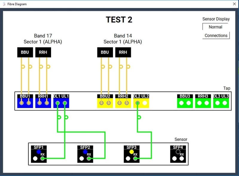 Once site info & test roster are configured and loaded. The tap and sensor can be connected, using the on-screen, colour-coded fibre diagram.