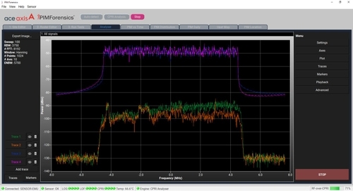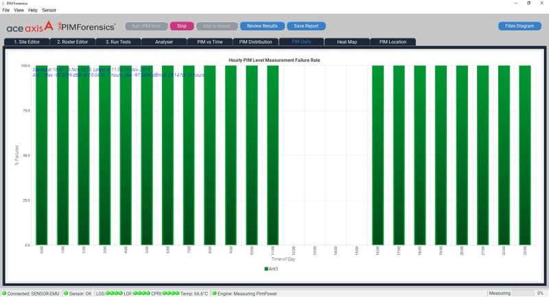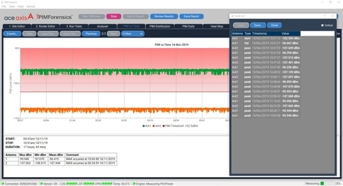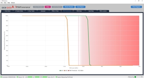 Once tap & sensor are configured PIM measurements for each UL antenna port can be performed.Six tabs display various useful information, each set of results can be saved to a report.