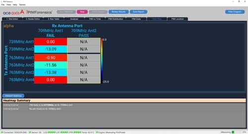 1.Heat Map: Uses the individual antenna contributions to indicate the likely source and position of those dominant PIM sources that are internal to the RF network or in the immediate vicinity of the antennas